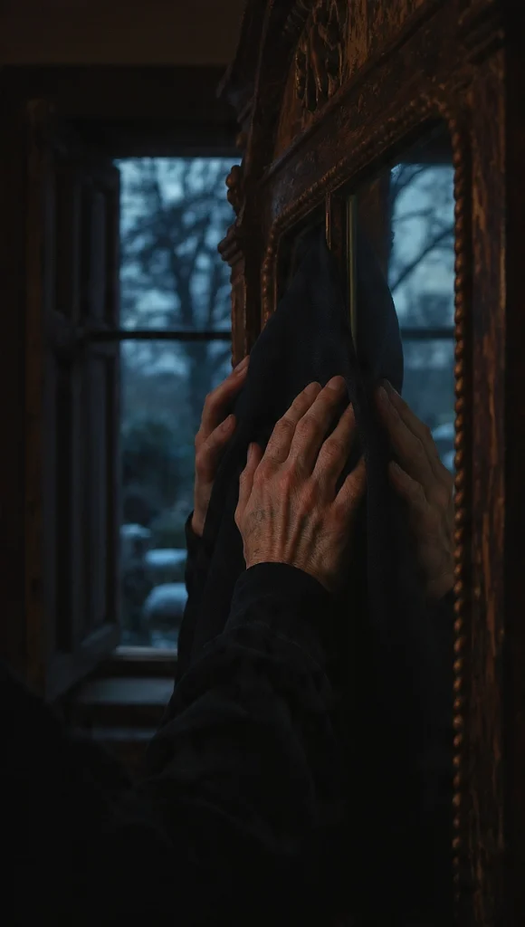 Spiegel verhängen: Alle spiegelnden Flächen im Raum wurden mit Tüchern abgedeckt, damit sich die wandelnde Seele nicht darin verirrte oder versehentlich das Spiegelbild eines Lebenden mit in die Schatten nahm.