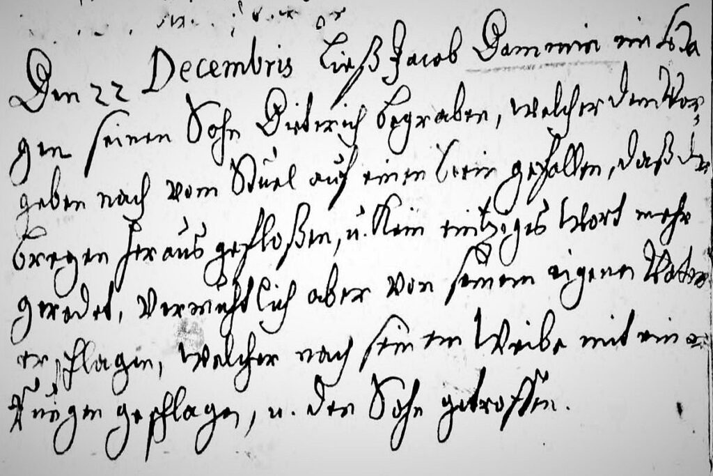 „Den 22. Decembris ließ Jacob Dammin ein (aus) Hagen seinen Sohn Dieterich begraben, welcher den Vorgaben nach vom Stuhl auf sein Hirn gefallen, daß der Bregen heraus geflossen, u. kein eintziges Wort mehr geredet, vermutlich aber von seinem eigenen Vater erschlagen, welcher noch sein Weibe mit einen Rungen geschlagen, u. den Sohn getroffen.“